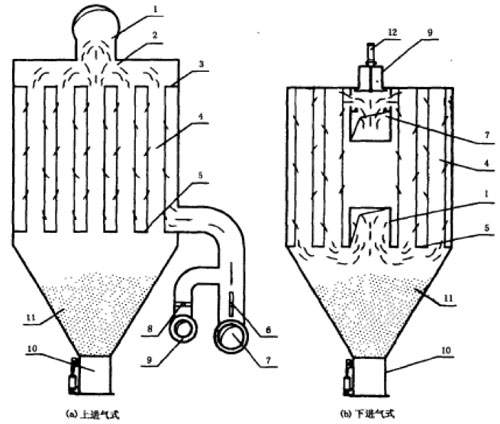 當(dāng)除塵器運(yùn)行阻力到一定值后,需對濾袋清灰。清灰工作狀態(tài),如圖8-3a所示。其工作過程如下:當(dāng)提升切換閥向下運(yùn)動,閥板在將出風(fēng)口關(guān)閉的同時打開反吹風(fēng)口和截止閥,由于反吹風(fēng)機(jī)鼓入的氣流是與過濾氣流方向相反的逆氣流,改變了濾袋內(nèi)外的壓差,使濾袋由“膨脹”變“縮癟”狀態(tài),剝離濾袋內(nèi)表面附著的粉塵層。提升切換閥向上運(yùn)動,閥板在將出風(fēng)口打開的同時關(guān)閉反吹風(fēng)口和截止閥,除塵濾袋重新“膨脹”,除塵器恢復(fù)到正常過濾狀態(tài)。