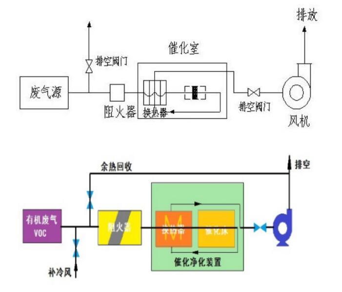 催化氧化技術(Catalytic Oxidizer,簡稱CO),通常是指將廢氣加熱到280℃以上,在催化劑的作用下將廢氣分解成CO2和和H2O,催化產(chǎn)生的高溫熱量被板式換熱器進行循環(huán)熱交換,從而節(jié)省運行能耗的一種VOCs治理技術。