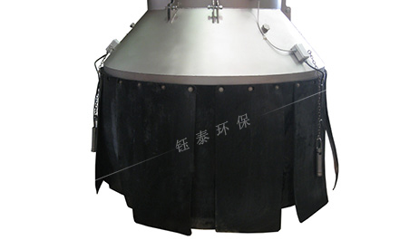 溜筒出口處的吸塵罩為多層結(jié)構(gòu),內(nèi)層為由皮帶膠組成的耐磨性能好、有一定相對(duì)硬度且具柔性的圍裙。皮帶膠圍裙主要用于緩解高速物料帶來(lái)的沖擊,緩沖高速氣流帶來(lái)的粉塵急速擴(kuò)散。吸塵罩的皮帶膠圍裙也起支撐作用,可以避免由于負(fù)壓作用,外層帆布裙被吸扁,碰到料位檢測(cè)裝置導(dǎo)致誤報(bào)信號(hào)或者在溜筒出料口干擾物料流動(dòng)。吸塵罩外層為雙重帆布圍裙,帆布裙的內(nèi)層長(zhǎng)度需比皮帶膠圍裙大,需完全罩住皮帶膠圍裙。帆布裙外層比內(nèi)層略大,需覆蓋住溜筒出口處的物料。雙重結(jié)構(gòu)主要用于控制粉塵外揚(yáng)及外部風(fēng)力作用將粉塵揚(yáng)起擴(kuò)散。整個(gè)吸塵罩在物料面和溜筒出口間構(gòu)成一個(gè)相對(duì)密閉的空間,防止粉塵外溢。