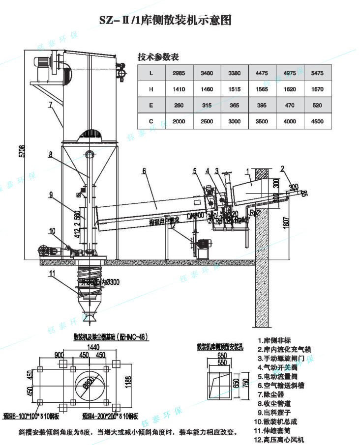 汽車散裝機出力200T/h,庫內中心下料,下料點為加濕機接口,在接口處設DN250的手動閥門和氣動閥門,下設電動鎖氣器和空氣斜槽(庫壁西側開800×800,將斜槽引出到庫外散裝口),將灰輸送至庫外散裝機。